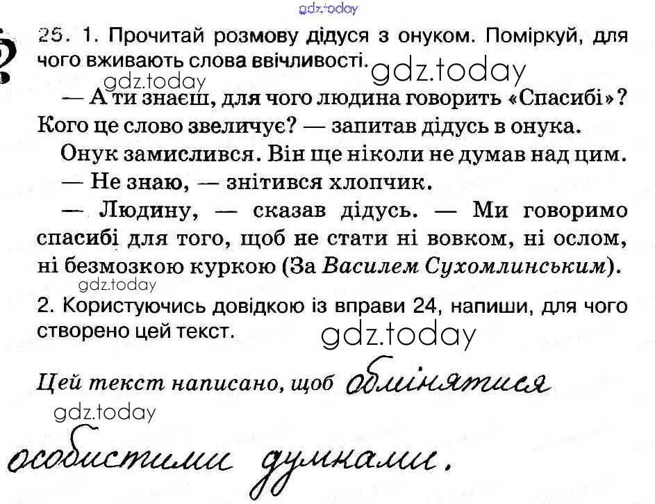 На страницах сайта gdz.today вы найдете учебный и вспомогательный материал, направленный на улучшения знаний школьной программы. ГДЗ - онлайн мир знаний Рішення до Вправи 25 Рабочей тетради по Украинскому языку для 3 класса Васильковская, Мельничайко Освiта 2014