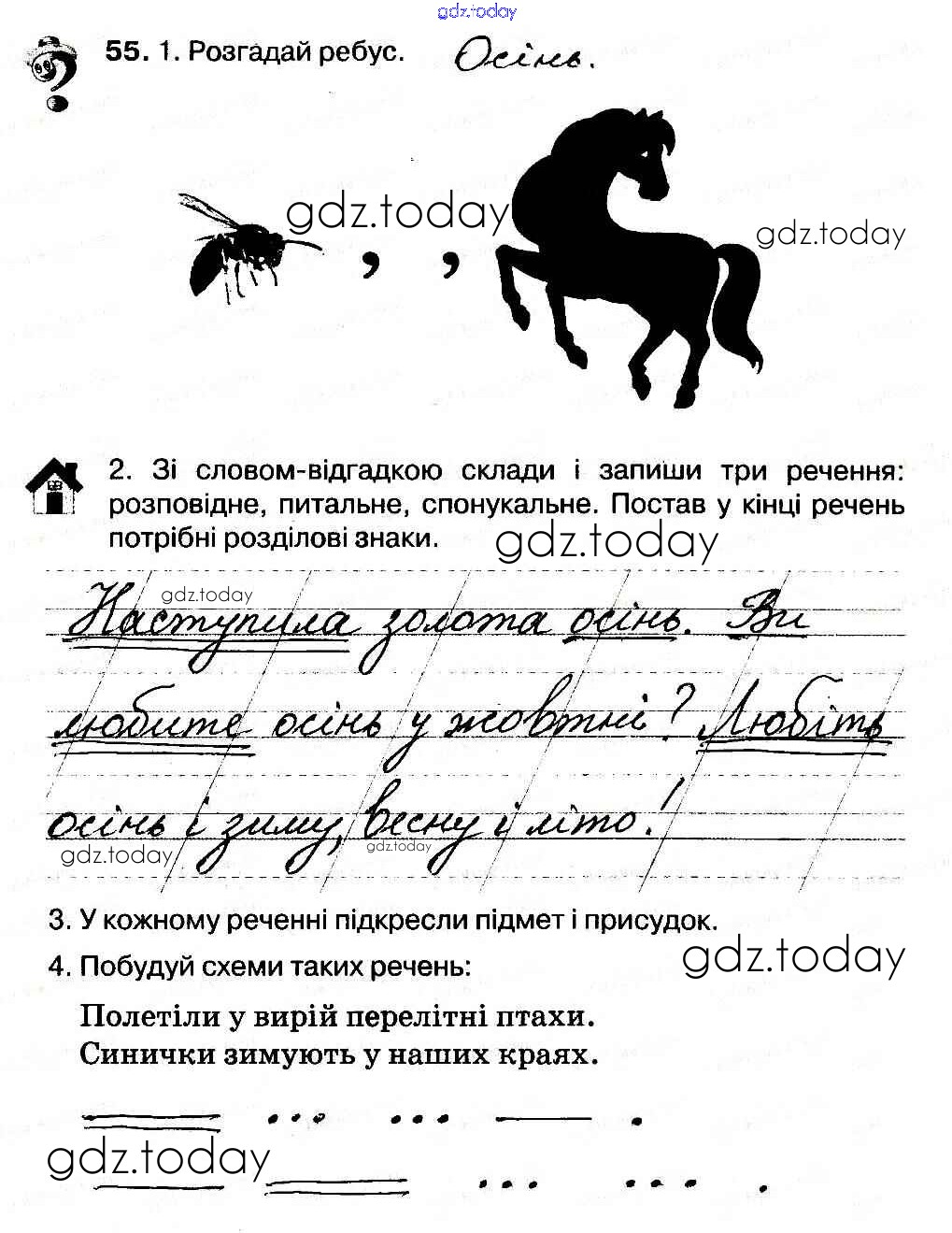 На страницах сайта gdz.today вы найдете учебный и вспомогательный материал, направленный на улучшения знаний школьной программы. ГДЗ - онлайн мир знаний Рішення до Вправи 55 Рабочей тетради по Украинскому языку для 3 класса Васильковская, Мельничайко Освiта 2014