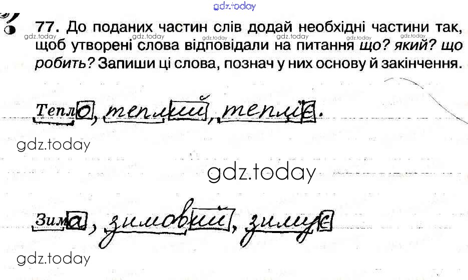 На страницах сайта gdz.today вы найдете учебный и вспомогательный материал, направленный на улучшения знаний школьной программы. ГДЗ - онлайн мир знаний Рішення до Вправи 77 Рабочей тетради по Украинскому языку для 3 класса Васильковская, Мельничайко Освiта 2014