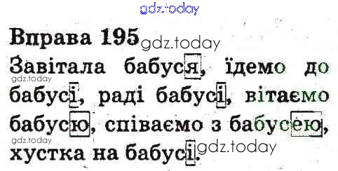 На страницах сайта gdz.today вы найдете учебный и вспомогательный материал, направленный на улучшения знаний школьной программы. ГДЗ - онлайн мир знаний Рішення до Вправи 195 Учебнику по Украинскому языку для 3 класса Гавриш, Макротенко Генеза 2014