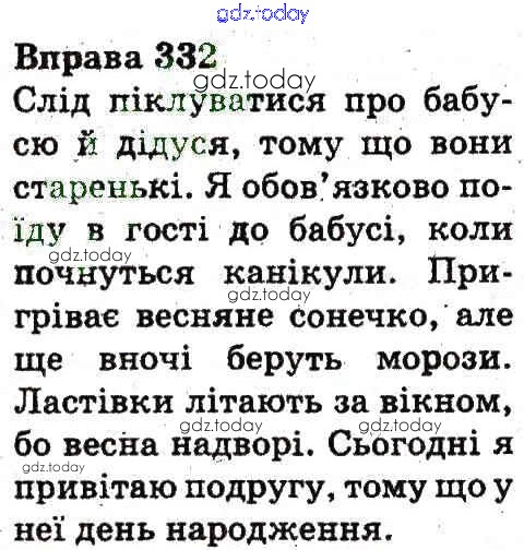 На страницах сайта gdz.today вы найдете учебный и вспомогательный материал, направленный на улучшения знаний школьной программы. ГДЗ - онлайн мир знаний Рішення до Вправи 332 Учебнику по Украинскому языку для 3 класса Гавриш, Макротенко Генеза 2014