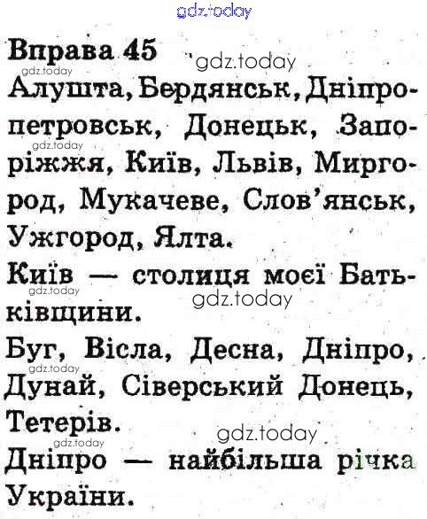 На страницах сайта gdz.today вы найдете учебный и вспомогательный материал, направленный на улучшения знаний школьной программы. ГДЗ - онлайн мир знаний Рішення до Вправи 45 Учебнику по Украинскому языку для 3 класса Гавриш, Макротенко Генеза 2014