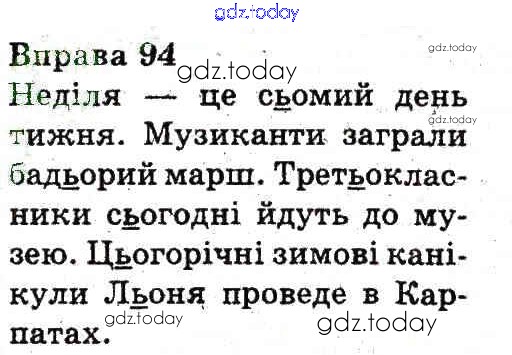 На страницах сайта gdz.today вы найдете учебный и вспомогательный материал, направленный на улучшения знаний школьной программы. ГДЗ - онлайн мир знаний Рішення до Вправи 94 Учебнику по Украинскому языку для 3 класса Гавриш, Макротенко Генеза 2014