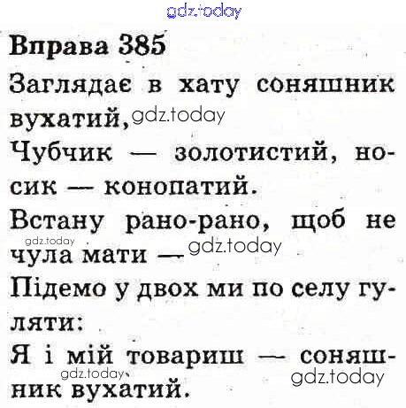 На страницах сайта gdz.today вы найдете учебный и вспомогательный материал, направленный на улучшения знаний школьной программы. ГДЗ - онлайн мир знаний Рішення до Вправи 385 Учебнику по Украинскому языку для 3 класса Вашуленко Украина 2013