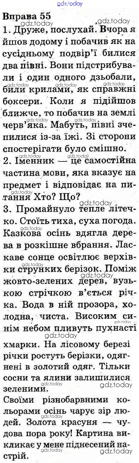 На страницах сайта gdz.today вы найдете учебный и вспомогательный материал, направленный на улучшения знаний школьной программы. ГДЗ - онлайн мир знаний Рішення до Вправи 55 Учебнику по Украинскому языку для 3 класса Вашуленко Украина 2013