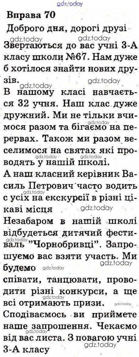 На страницах сайта gdz.today вы найдете учебный и вспомогательный материал, направленный на улучшения знаний школьной программы. ГДЗ - онлайн мир знаний Рішення до Вправи 70 Учебнику по Украинскому языку для 3 класса Вашуленко Украина 2013