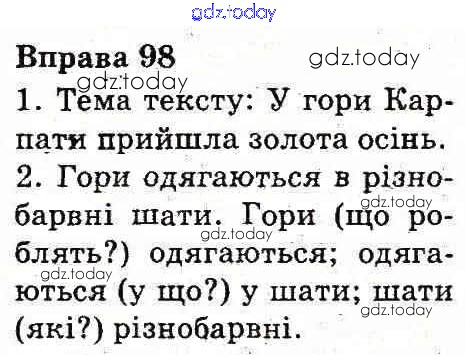 На страницах сайта gdz.today вы найдете учебный и вспомогательный материал, направленный на улучшения знаний школьной программы. ГДЗ - онлайн мир знаний Рішення до Вправи 98 Учебнику по Украинскому языку для 3 класса Вашуленко Украина 2013