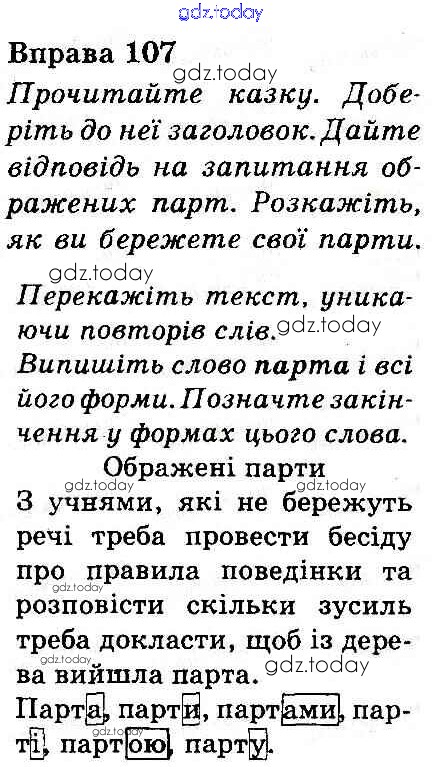 На страницах сайта gdz.today вы найдете учебный и вспомогательный материал, направленный на улучшения знаний школьной программы. ГДЗ - онлайн мир знаний Рішення до Вправи 107 Учебнику по Украинскому языку для 3 класса Захарийчук, Мовчун Грамота 2013