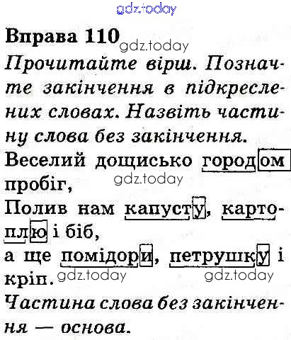 На страницах сайта gdz.today вы найдете учебный и вспомогательный материал, направленный на улучшения знаний школьной программы. ГДЗ - онлайн мир знаний Рішення до Вправи 110 Учебнику по Украинскому языку для 3 класса Захарийчук, Мовчун Грамота 2013