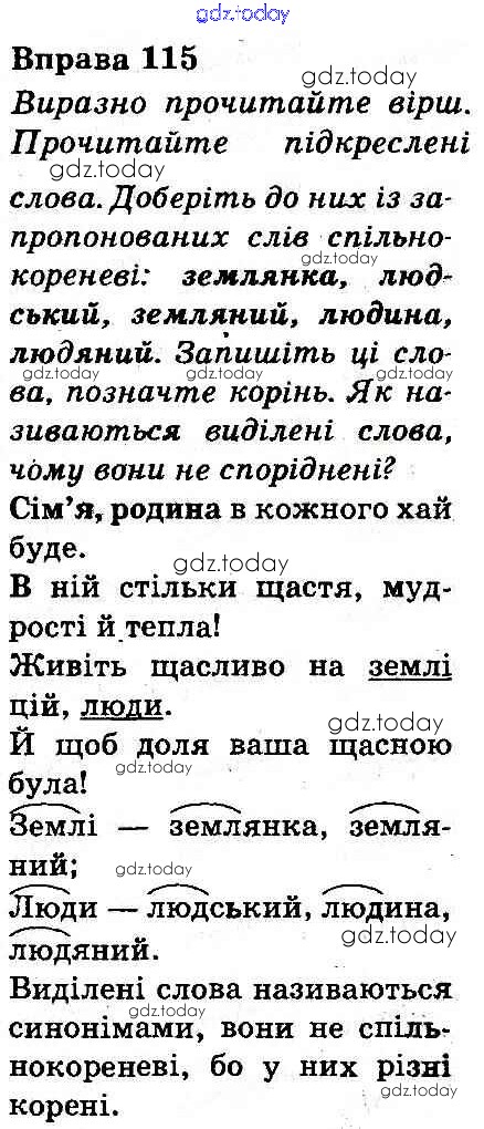 На страницах сайта gdz.today вы найдете учебный и вспомогательный материал, направленный на улучшения знаний школьной программы. ГДЗ - онлайн мир знаний Рішення до Вправи 115 Учебнику по Украинскому языку для 3 класса Захарийчук, Мовчун Грамота 2013