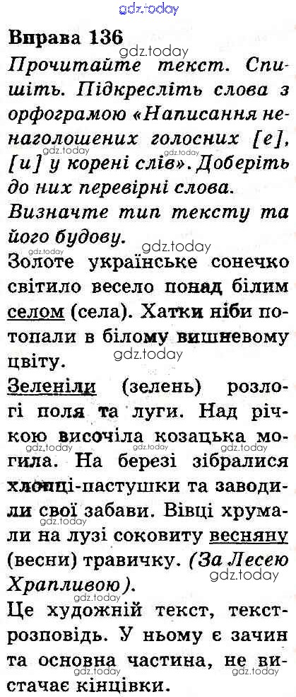 На страницах сайта gdz.today вы найдете учебный и вспомогательный материал, направленный на улучшения знаний школьной программы. ГДЗ - онлайн мир знаний Рішення до Вправи 136 Учебнику по Украинскому языку для 3 класса Захарийчук, Мовчун Грамота 2013