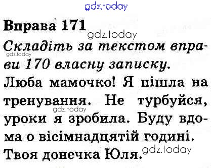 На страницах сайта gdz.today вы найдете учебный и вспомогательный материал, направленный на улучшения знаний школьной программы. ГДЗ - онлайн мир знаний Рішення до Вправи 171 Учебнику по Украинскому языку для 3 класса Захарийчук, Мовчун Грамота 2013