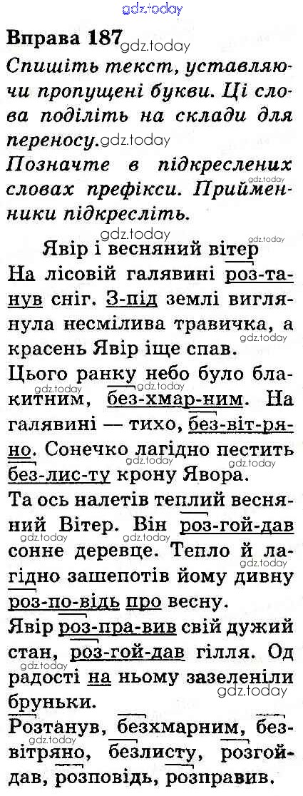 На страницах сайта gdz.today вы найдете учебный и вспомогательный материал, направленный на улучшения знаний школьной программы. ГДЗ - онлайн мир знаний Рішення до Вправи 187 Учебнику по Украинскому языку для 3 класса Захарийчук, Мовчун Грамота 2013