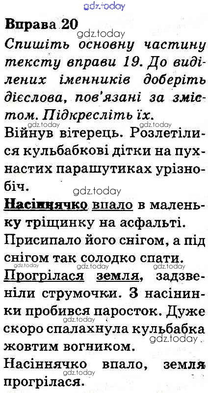 На страницах сайта gdz.today вы найдете учебный и вспомогательный материал, направленный на улучшения знаний школьной программы. ГДЗ - онлайн мир знаний Рішення до Вправи 20 Учебнику по Украинскому языку для 3 класса Захарийчук, Мовчун Грамота 2013