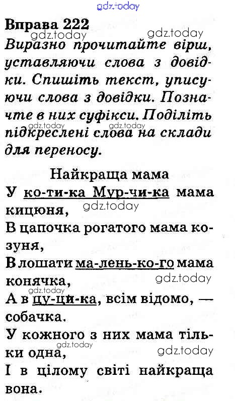 На страницах сайта gdz.today вы найдете учебный и вспомогательный материал, направленный на улучшения знаний школьной программы. ГДЗ - онлайн мир знаний Рішення до Вправи 222 Учебнику по Украинскому языку для 3 класса Захарийчук, Мовчун Грамота 2013