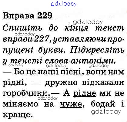 На страницах сайта gdz.today вы найдете учебный и вспомогательный материал, направленный на улучшения знаний школьной программы. ГДЗ - онлайн мир знаний Рішення до Вправи 229 Учебнику по Украинскому языку для 3 класса Захарийчук, Мовчун Грамота 2013