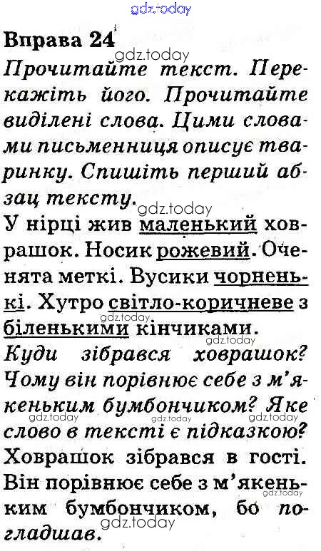 На страницах сайта gdz.today вы найдете учебный и вспомогательный материал, направленный на улучшения знаний школьной программы. ГДЗ - онлайн мир знаний Рішення до Вправи 24 Учебнику по Украинскому языку для 3 класса Захарийчук, Мовчун Грамота 2013