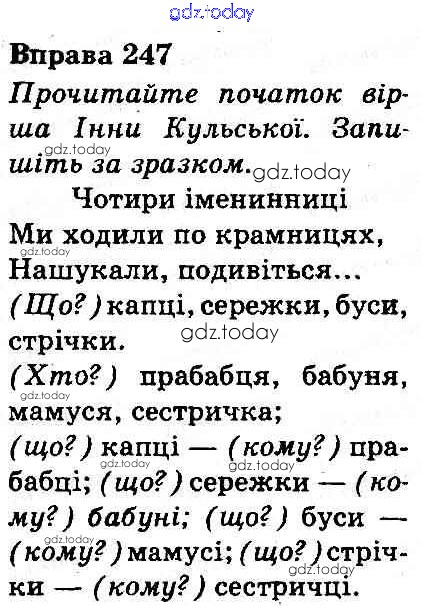 На страницах сайта gdz.today вы найдете учебный и вспомогательный материал, направленный на улучшения знаний школьной программы. ГДЗ - онлайн мир знаний Рішення до Вправи 247 Учебнику по Украинскому языку для 3 класса Захарийчук, Мовчун Грамота 2013