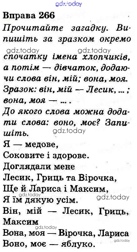 На страницах сайта gdz.today вы найдете учебный и вспомогательный материал, направленный на улучшения знаний школьной программы. ГДЗ - онлайн мир знаний Рішення до Вправи 266 Учебнику по Украинскому языку для 3 класса Захарийчук, Мовчун Грамота 2013