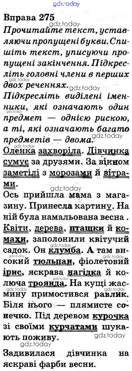 На страницах сайта gdz.today вы найдете учебный и вспомогательный материал, направленный на улучшения знаний школьной программы. ГДЗ - онлайн мир знаний Рішення до Вправи 275 Учебнику по Украинскому языку для 3 класса Захарийчук, Мовчун Грамота 2013