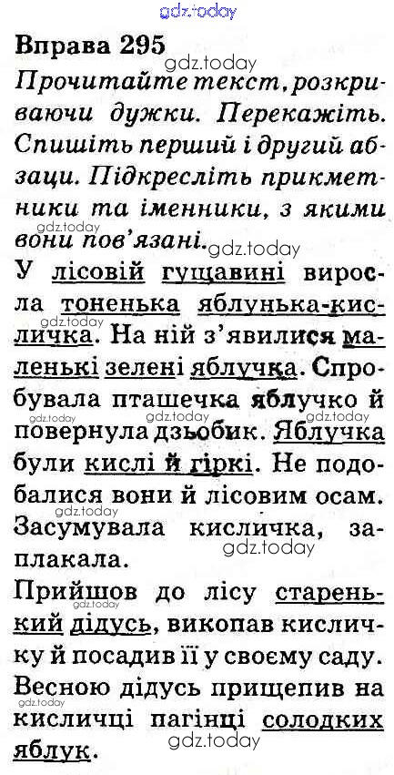 На страницах сайта gdz.today вы найдете учебный и вспомогательный материал, направленный на улучшения знаний школьной программы. ГДЗ - онлайн мир знаний Рішення до Вправи 295 Учебнику по Украинскому языку для 3 класса Захарийчук, Мовчун Грамота 2013