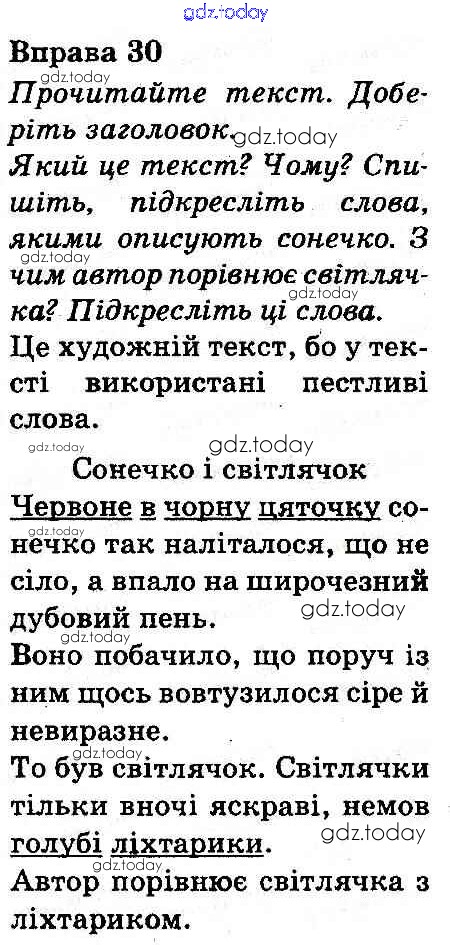 На страницах сайта gdz.today вы найдете учебный и вспомогательный материал, направленный на улучшения знаний школьной программы. ГДЗ - онлайн мир знаний Рішення до Вправи 30 Учебнику по Украинскому языку для 3 класса Захарийчук, Мовчун Грамота 2013