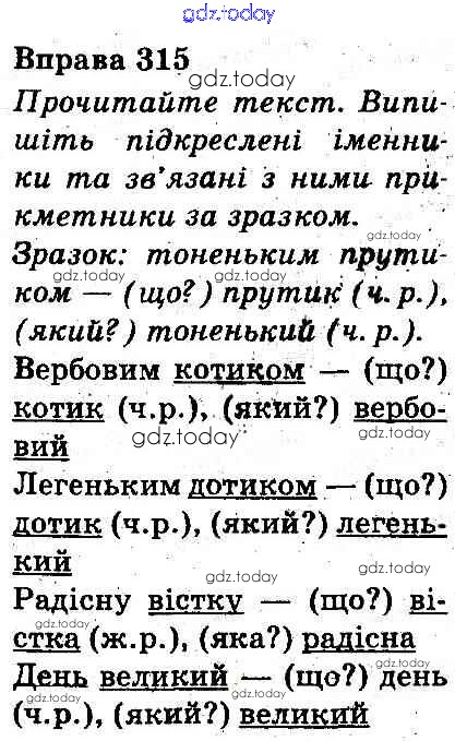 На страницах сайта gdz.today вы найдете учебный и вспомогательный материал, направленный на улучшения знаний школьной программы. ГДЗ - онлайн мир знаний Рішення до Вправи 315 Учебнику по Украинскому языку для 3 класса Захарийчук, Мовчун Грамота 2013