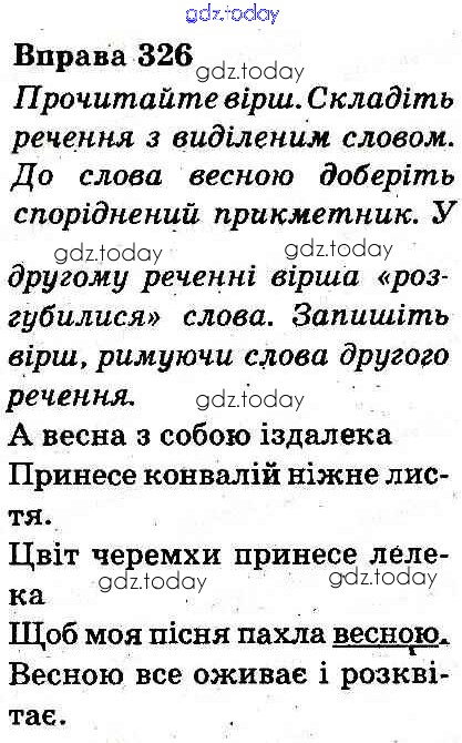 На страницах сайта gdz.today вы найдете учебный и вспомогательный материал, направленный на улучшения знаний школьной программы. ГДЗ - онлайн мир знаний Рішення до Вправи 326 Учебнику по Украинскому языку для 3 класса Захарийчук, Мовчун Грамота 2013