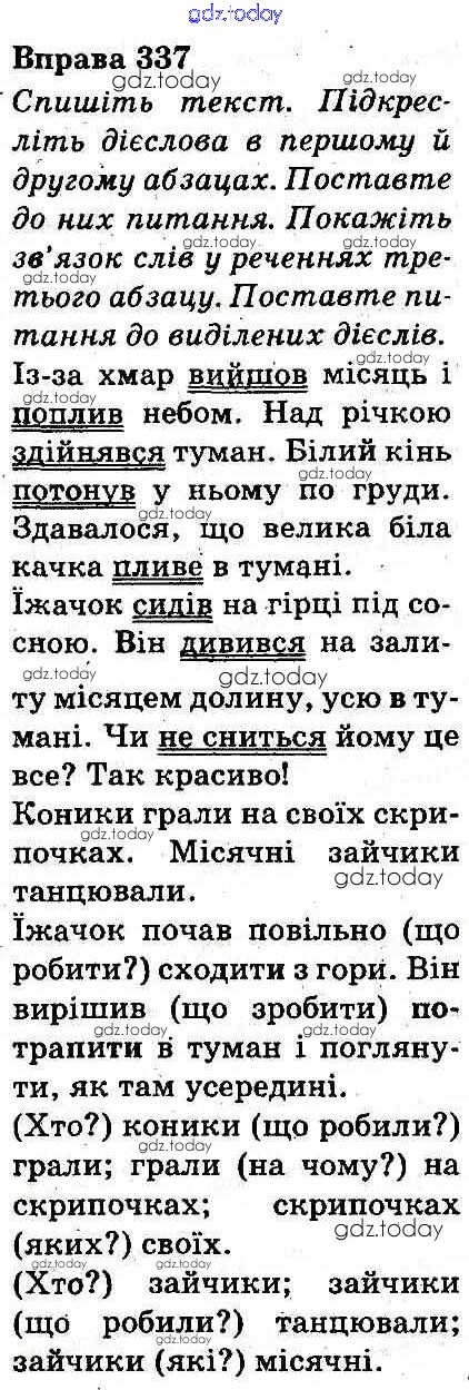 На страницах сайта gdz.today вы найдете учебный и вспомогательный материал, направленный на улучшения знаний школьной программы. ГДЗ - онлайн мир знаний Рішення до Вправи 337 Учебнику по Украинскому языку для 3 класса Захарийчук, Мовчун Грамота 2013