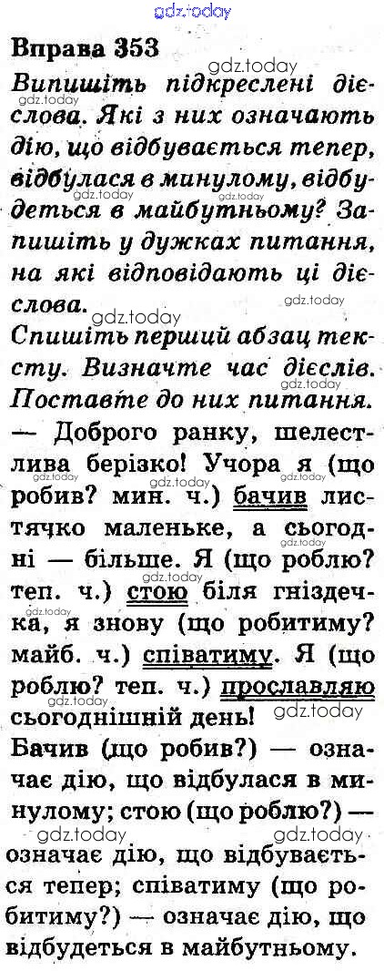 На страницах сайта gdz.today вы найдете учебный и вспомогательный материал, направленный на улучшения знаний школьной программы. ГДЗ - онлайн мир знаний Рішення до Вправи 353 Учебнику по Украинскому языку для 3 класса Захарийчук, Мовчун Грамота 2013