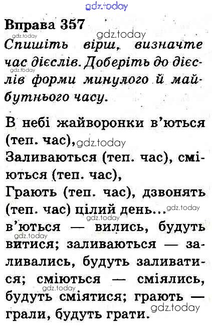 На страницах сайта gdz.today вы найдете учебный и вспомогательный материал, направленный на улучшения знаний школьной программы. ГДЗ - онлайн мир знаний Рішення до Вправи 357 Учебнику по Украинскому языку для 3 класса Захарийчук, Мовчун Грамота 2013