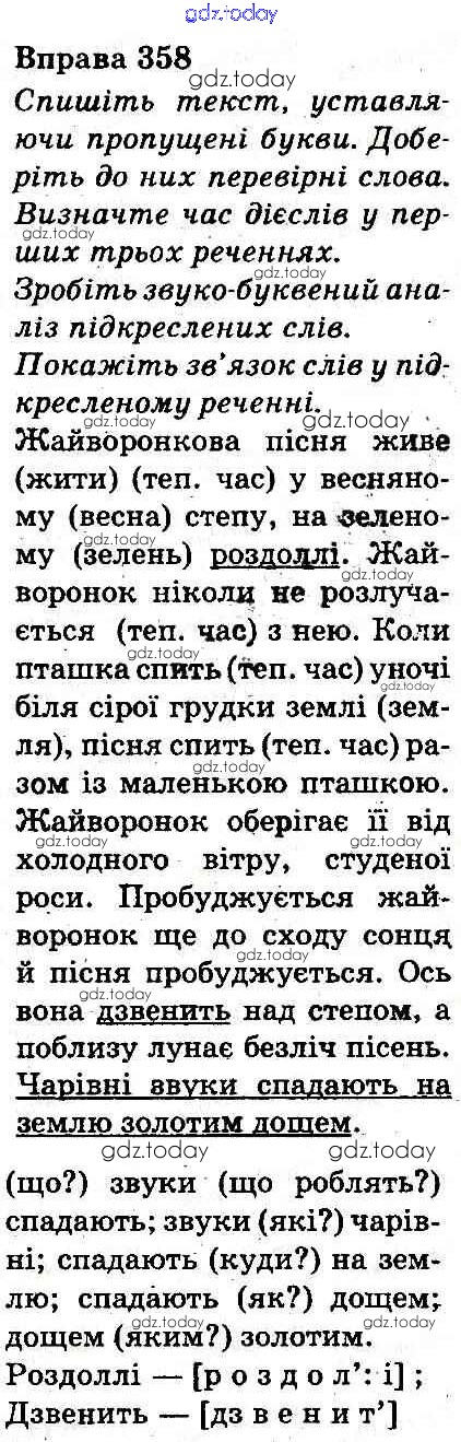 На страницах сайта gdz.today вы найдете учебный и вспомогательный материал, направленный на улучшения знаний школьной программы. ГДЗ - онлайн мир знаний Рішення до Вправи 358 Учебнику по Украинскому языку для 3 класса Захарийчук, Мовчун Грамота 2013