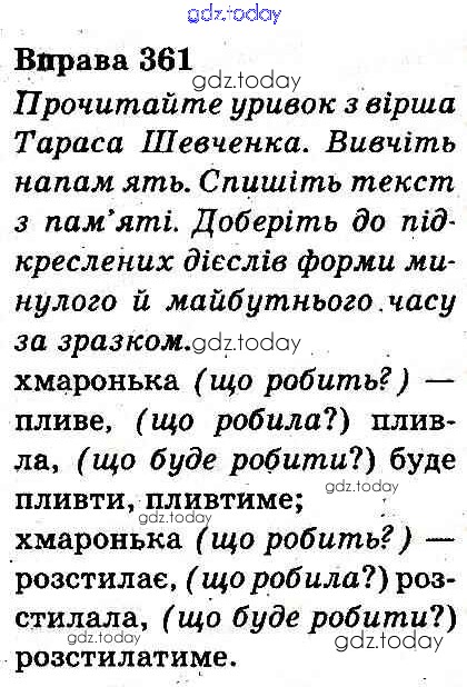На страницах сайта gdz.today вы найдете учебный и вспомогательный материал, направленный на улучшения знаний школьной программы. ГДЗ - онлайн мир знаний Рішення до Вправи 361 Учебнику по Украинскому языку для 3 класса Захарийчук, Мовчун Грамота 2013
