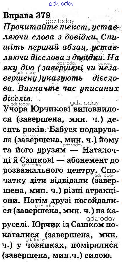 На страницах сайта gdz.today вы найдете учебный и вспомогательный материал, направленный на улучшения знаний школьной программы. ГДЗ - онлайн мир знаний Рішення до Вправи 379 Учебнику по Украинскому языку для 3 класса Захарийчук, Мовчун Грамота 2013