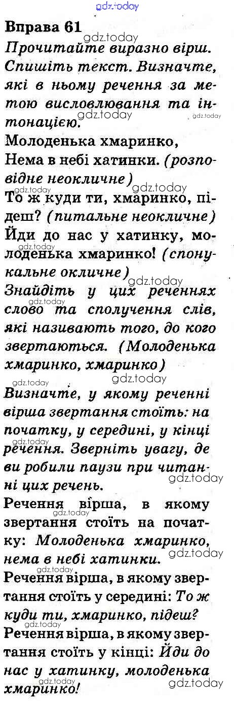 На страницах сайта gdz.today вы найдете учебный и вспомогательный материал, направленный на улучшения знаний школьной программы. ГДЗ - онлайн мир знаний Рішення до Вправи 61 Учебнику по Украинскому языку для 3 класса Захарийчук, Мовчун Грамота 2013