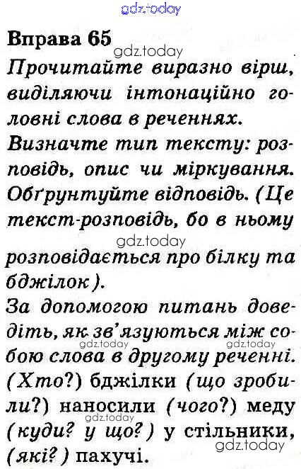 На страницах сайта gdz.today вы найдете учебный и вспомогательный материал, направленный на улучшения знаний школьной программы. ГДЗ - онлайн мир знаний Рішення до Вправи 65 Учебнику по Украинскому языку для 3 класса Захарийчук, Мовчун Грамота 2013