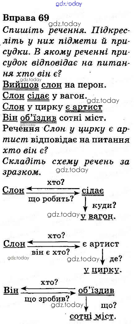 На страницах сайта gdz.today вы найдете учебный и вспомогательный материал, направленный на улучшения знаний школьной программы. ГДЗ - онлайн мир знаний Рішення до Вправи 69 Учебнику по Украинскому языку для 3 класса Захарийчук, Мовчун Грамота 2013