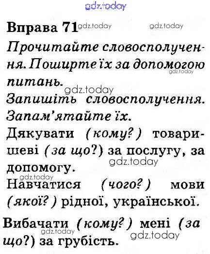 На страницах сайта gdz.today вы найдете учебный и вспомогательный материал, направленный на улучшения знаний школьной программы. ГДЗ - онлайн мир знаний Рішення до Вправи 71 Учебнику по Украинскому языку для 3 класса Захарийчук, Мовчун Грамота 2013