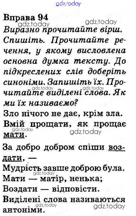 На страницах сайта gdz.today вы найдете учебный и вспомогательный материал, направленный на улучшения знаний школьной программы. ГДЗ - онлайн мир знаний Рішення до Вправи 94 Учебнику по Украинскому языку для 3 класса Захарийчук, Мовчун Грамота 2013