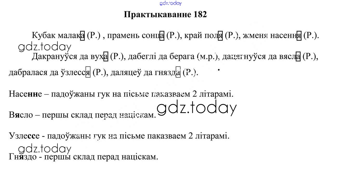 На страницах сайта gdz.today вы найдете учебный и вспомогательный материал, направленный на улучшения знаний школьной программы. ГДЗ - онлайн мир знаний Рашальнік да часткі 1. Практыкаванні 182 Учебнику по Белорусскому языку для 4 класса Свірыдзенка Национальный институт образования 2018