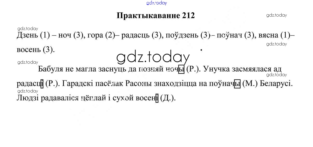 На страницах сайта gdz.today вы найдете учебный и вспомогательный материал, направленный на улучшения знаний школьной программы. ГДЗ - онлайн мир знаний Рашальнік да часткі 1. Практыкаванні 212 Учебнику по Белорусскому языку для 4 класса Свірыдзенка Национальный институт образования 2018