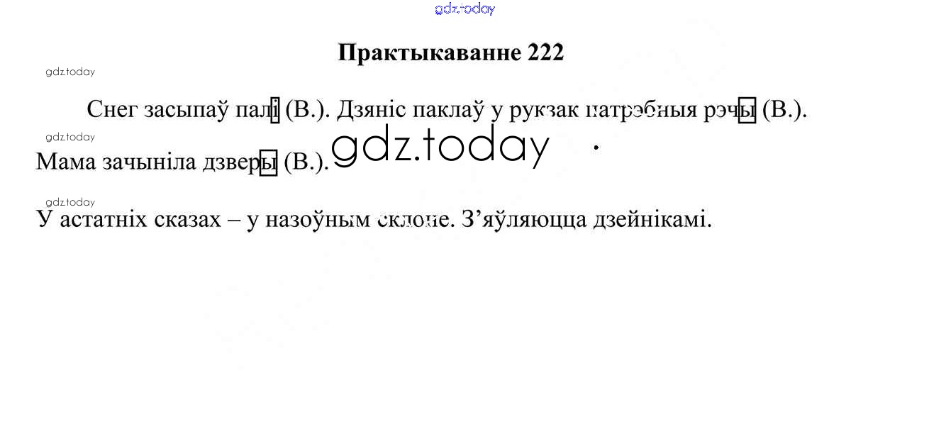 На страницах сайта gdz.today вы найдете учебный и вспомогательный материал, направленный на улучшения знаний школьной программы. ГДЗ - онлайн мир знаний Рашальнік да часткі 1. Практыкаванні 222 Учебнику по Белорусскому языку для 4 класса Свірыдзенка Национальный институт образования 2018