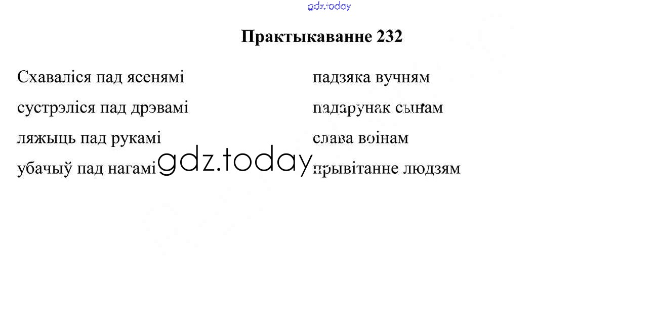 На страницах сайта gdz.today вы найдете учебный и вспомогательный материал, направленный на улучшения знаний школьной программы. ГДЗ - онлайн мир знаний Рашальнік да часткі 1. Практыкаванні 232 Учебнику по Белорусскому языку для 4 класса Свірыдзенка Национальный институт образования 2018