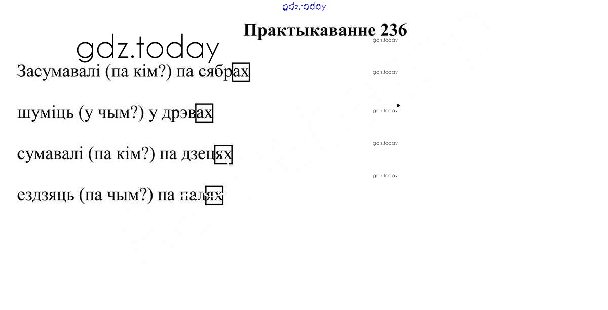 На страницах сайта gdz.today вы найдете учебный и вспомогательный материал, направленный на улучшения знаний школьной программы. ГДЗ - онлайн мир знаний Рашальнік да часткі 1. Практыкаванні 236 Учебнику по Белорусскому языку для 4 класса Свірыдзенка Национальный институт образования 2018