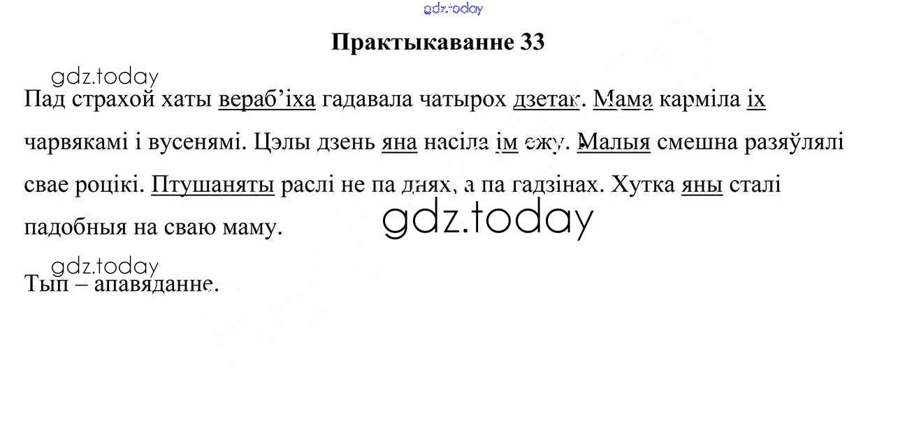 На страницах сайта gdz.today вы найдете учебный и вспомогательный материал, направленный на улучшения знаний школьной программы. ГДЗ - онлайн мир знаний Рашальнік да часткі 1. Практыкаванні 33 Учебнику по Белорусскому языку для 4 класса Свірыдзенка Национальный институт образования 2018