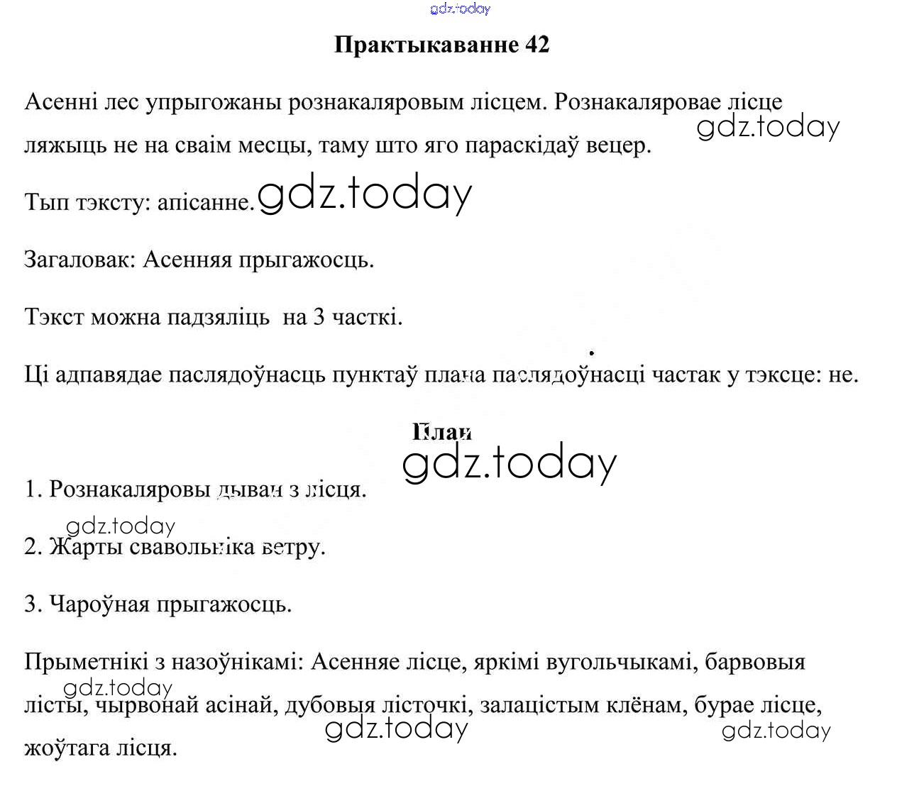 На страницах сайта gdz.today вы найдете учебный и вспомогательный материал, направленный на улучшения знаний школьной программы. ГДЗ - онлайн мир знаний Рашальнік да часткі 1. Практыкаванні 42 Учебнику по Белорусскому языку для 4 класса Свірыдзенка Национальный институт образования 2018