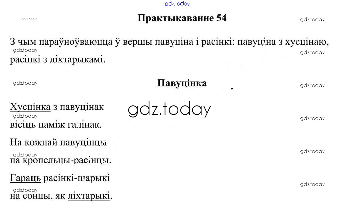 На страницах сайта gdz.today вы найдете учебный и вспомогательный материал, направленный на улучшения знаний школьной программы. ГДЗ - онлайн мир знаний Рашальнік да часткі 1. Практыкаванні 54 Учебнику по Белорусскому языку для 4 класса Свірыдзенка Национальный институт образования 2018