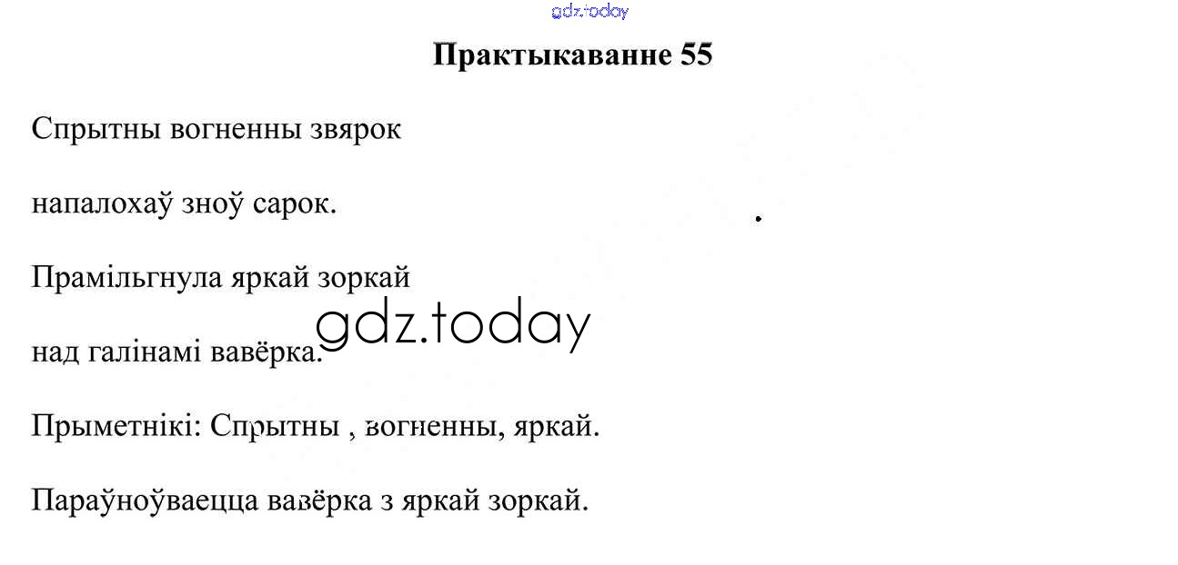 На страницах сайта gdz.today вы найдете учебный и вспомогательный материал, направленный на улучшения знаний школьной программы. ГДЗ - онлайн мир знаний Рашальнік да часткі 1. Практыкаванні 55 Учебнику по Белорусскому языку для 4 класса Свірыдзенка Национальный институт образования 2018
