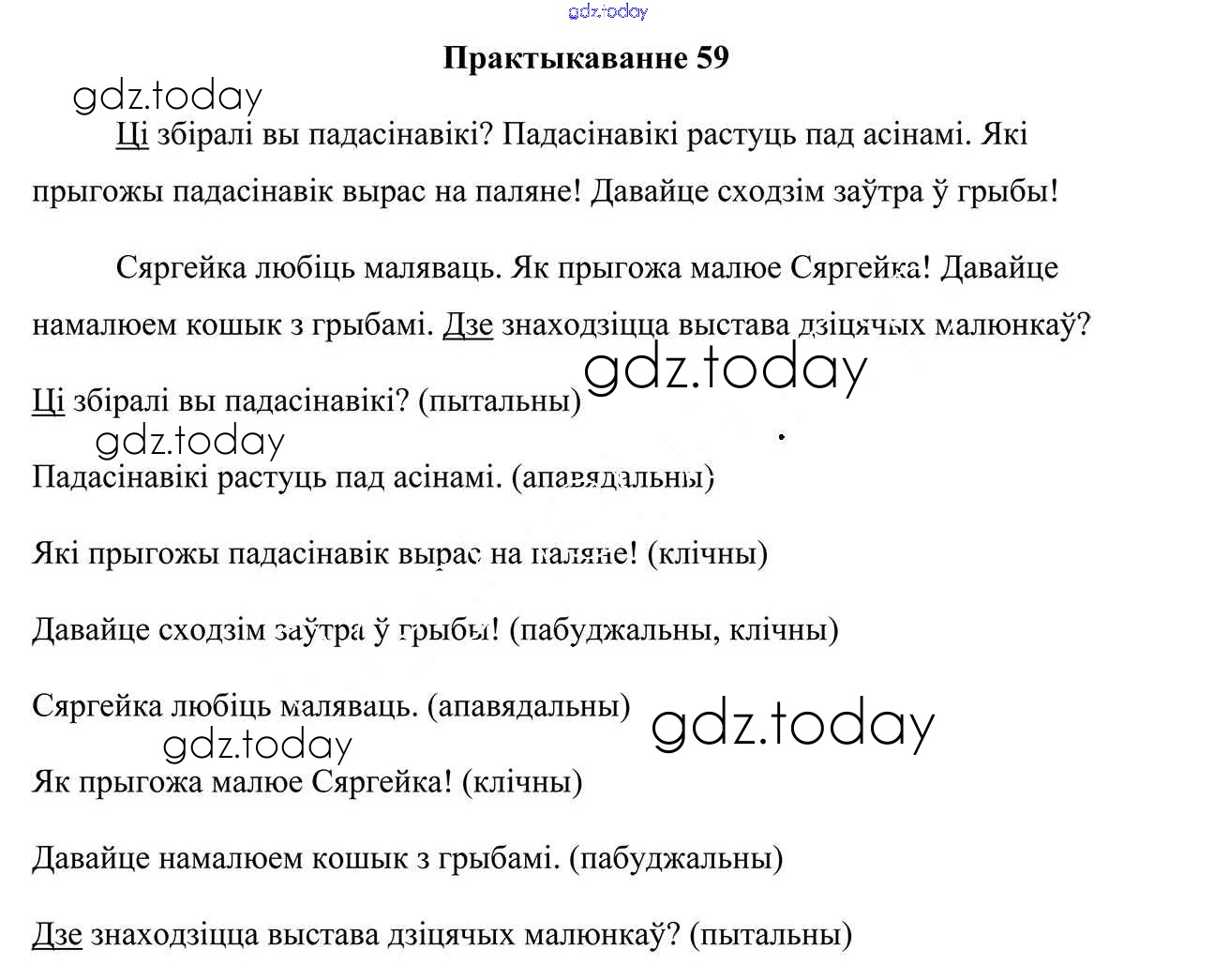 На страницах сайта gdz.today вы найдете учебный и вспомогательный материал, направленный на улучшения знаний школьной программы. ГДЗ - онлайн мир знаний Рашальнік да часткі 1. Практыкаванні 59 Учебнику по Белорусскому языку для 4 класса Свірыдзенка Национальный институт образования 2018