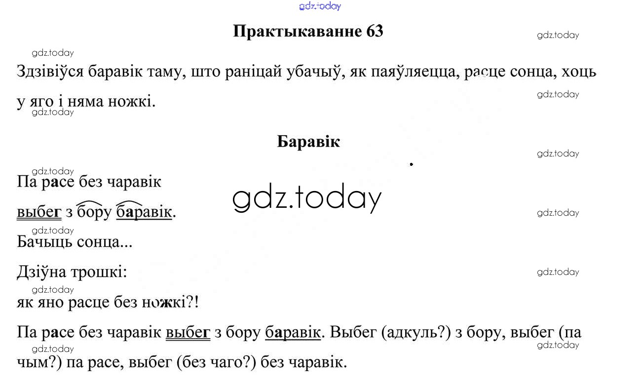На страницах сайта gdz.today вы найдете учебный и вспомогательный материал, направленный на улучшения знаний школьной программы. ГДЗ - онлайн мир знаний Рашальнік да часткі 1. Практыкаванні 63 Учебнику по Белорусскому языку для 4 класса Свірыдзенка Национальный институт образования 2018